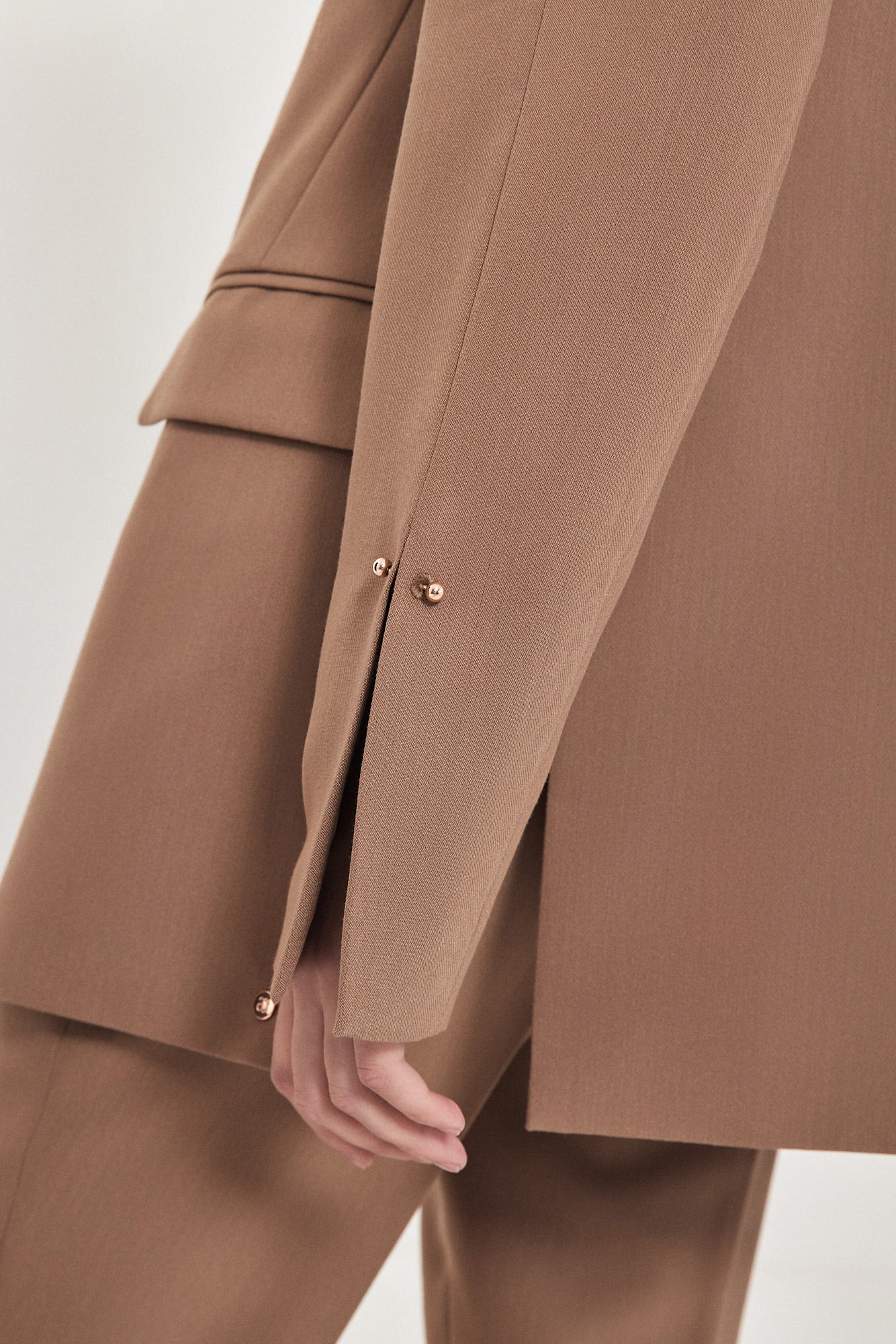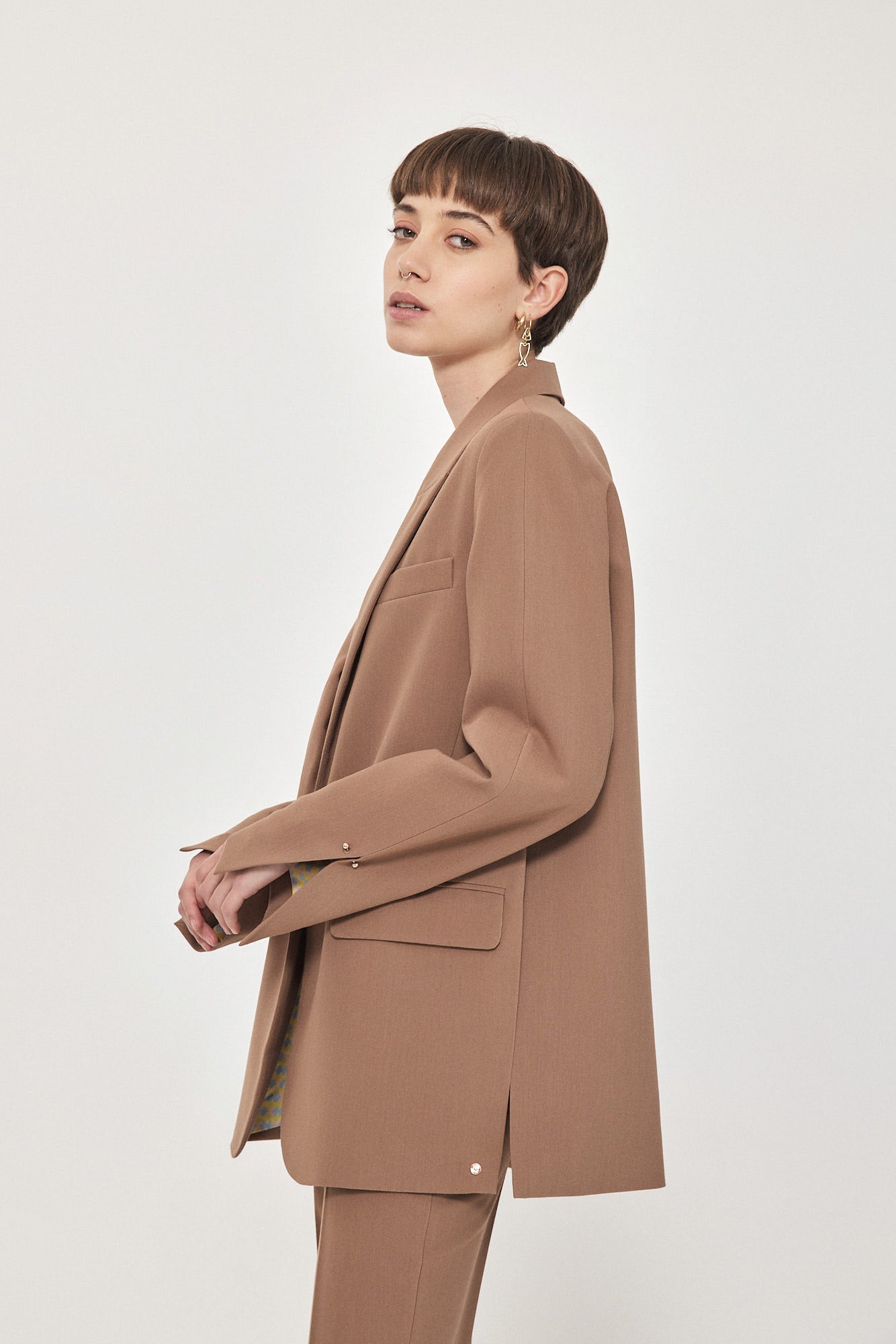 ג׳קט מחויט מבית המותג אוסטבל עם סגירת מוט ועיגול פרונטלית בצבע כסוף ופירסינג בשרוולים. שסעים עמוקים עד המותן משני הצדדים